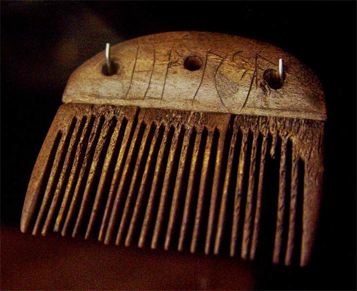 Y buscando buscando me topé con el posible origen, en la antigüedad era costumbre marcar ciertos objetos con símbolos, en Europa, algunos pueblos marcaban armas y también peines con runas y da la casualidad que la inscripción rúnica mas antigua de que se tiene constancia, esta en un objeto y este es... un peine!!!, es el peine de Vimose, inscripción datada alrededor del año 160, encontrado en una ciénaga de Vimose, en Fionia, Dinamarca, en el se lee harja y tiene dos posibles significados, guerrero proveniente de el protogermanico o simplemente puede significar peine.